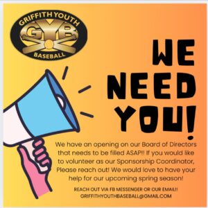 Please send an email with your desired position(s) to griffithyouthbaseball@gmail.com if interested, prior to our board meeting on October 5th, 2025. Voting will take place at that board meeting.